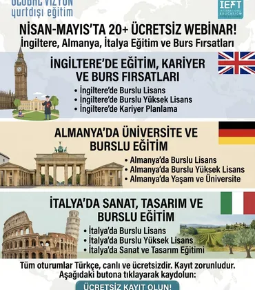 Almanya mı, İtalya mı, İngiltere mi? Nisan-Mayıs'ta 20+ Ücretsiz Webinar!Avrupa'da Üniversite Okumak İstiyorsan, Bu Webinarlar Tam Sana Göre! Nisan-Mayıs ayları boyunca İngiltere, Almanya ve İtalya'daki eğitim fırsatlarını anlatan 20'den fazla ücretsiz webinar düzenliyoruz. Tüm oturumlar canlı, Türkçe ve kayıt zorunlu. İlgilendiğin webinara tıkla ve doğrudan Zoom kayıt sayfasına git.